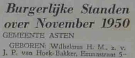 | Op 20-11-1950 wordt hun zoon Wilhelmus (Willy) van Hoek geboren en rechts wordt in het Peelbelang van 09-12-1950 zijn geboorte genoemd. | ![]() |