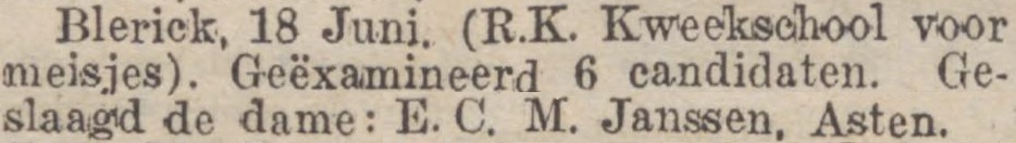 Elisabeth Catharina Maria Janssen is geboren te Asten op 21-09-1908 als dochter van Bernardus Janssen en Wilhelmina Leermakers (zie Monseigneur den Dubbeldenstraat 4). Zij studeerde in Blerick en volgens het Limburgsch dagblad van 20-06-1927 slaagt zij in 1927 voor de akte lager onderwijs: