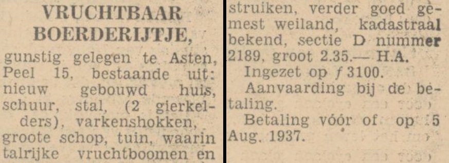 Hieronder in de krant de Zuid-Willemsvaart van 01-05-1937 de verkoop van het huis door Jacob Hubertus Peeters:
