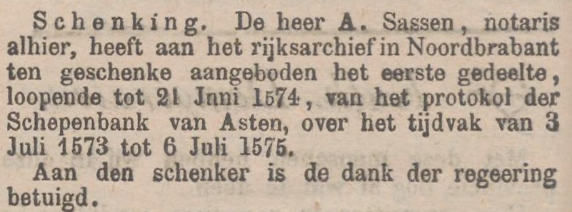 * het blijkt dat het 'Protocolle oft van brieven der heerlicheyt van Asten beghinnende den 3de juli Anno 1573 eyndende 6 juli 1575', ofwel door Gaudentius G. Slaats als 'Asten Rechterlijk Archief deel 66' door de Helmondse notaris, historicus en letterkundige August Hendrik Sassen aan het rijksarchief van Noord-Brabant is geschonken, zoals genoemd in het Dagblad van Noord-Brabant van 14-06-1901. | ![]() |